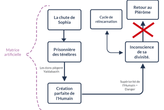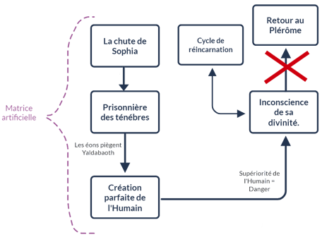 Depuis lors, il semble que nous existions dans une réplique dénaturée du monde primitif du plérôme. Ce monde, œuvre d'un demiurge, se présente sous la forme d'une matrice artificielle, en opposition avec la matrice originelle, celle où nous aurions dû résider si un événement fâcheux n'avait pas perturbé l'ordre des choses. Nous y sommes immergés dès notre venue au monde, et ce, entre chaque cycle d'incarnations également. L'objectif ultime pour un être éveillé consiste à se libérer de la matrice artificielle au moment de sa mort, autrement dit, à briser le cycle des réincarnations, le samsara des traditions orientales.