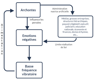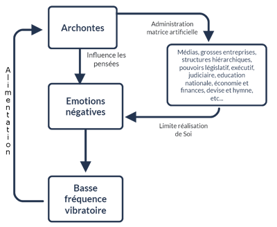 Pour maintenir l'homme dans l'ignorance de sa véritable nature, les Archontes emploient une méthode insidieuse : ils le persuadent qu'il est l'opposé de ce qu'il est réellement. Ainsi, ils le convainquent de sa faiblesse, de son impuissance, de son dénuement et de sa séparation d'avec la Source, alors même qu'il en est intrinsèquement une partie. Agissant comme des parasites psychiques, les Archontes insufflent des pensées à l'homme par des moyens que celui-ci est loin de suspecter, souvent là où il s'y attend le moins : à travers ses propres pensées. Ces pensées induites engendrent des émotions qui, à leur tour, produisent une fréquence vibratoire dont se nourrissent les Archontes. Ils procèdent ainsi parce qu'ils ne sont pas autonomes et dépendent de cette énergie pour exister et se renforcer.