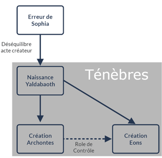 Un jour, toutefois, Sophia décida de créer seule. Cette tentative solitaire provoqua un déséquilibre, engendrant une aberration : une créature monstrueuse à tête de lion et corps de serpent. Terrifiée par les conséquences de son acte, Sophia réalisa son erreur et chercha à dissimuler cette créature. C'est ainsi que Sophia rejeta la créature monstrueuse dans les ténébres situés sous le Plérôme, espérant cacher à jamais l'erreur de son audace solitaire. Cette aberration fut nommé "Yaldabaoth".
