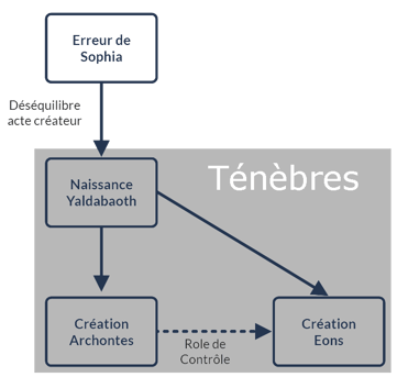 Rejeté dans les ténèbres, Yaldabaoth ignora tout de ses origines. Isolé, il se mit également à créer des éons dans ce nouveau monde. Pour structurer et gouverner ces nouveaux éons, il instaura des archontes (du grec arkhon, signifiant commander). La fonction des archontes est de maintenir les âmes de ce monde dans l'illusion, les empêchant donc de retourner au Plérôme. Le but est de confiner ces âmes dans l'ignorance, les privant de l'évolution vers des plans supérieurs de conscience.